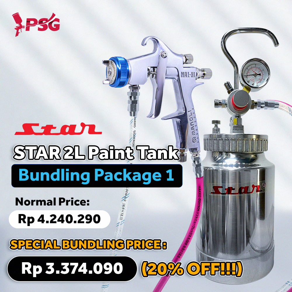 Bagi yang mencari produk bundling sudah satu set dengan paint tank Star Taiwan kini sudah tersedia paket setnya yang kami lengkapi dengan spraygun Manoli MAL-H1 yang merupakan versi upgraded dari W-101 yang menghasilkan hasil atomisasi yang lebih halus dan lembut lagi cocok bagi Anda yang mencari untuk kebutuhan finishing tinggi.